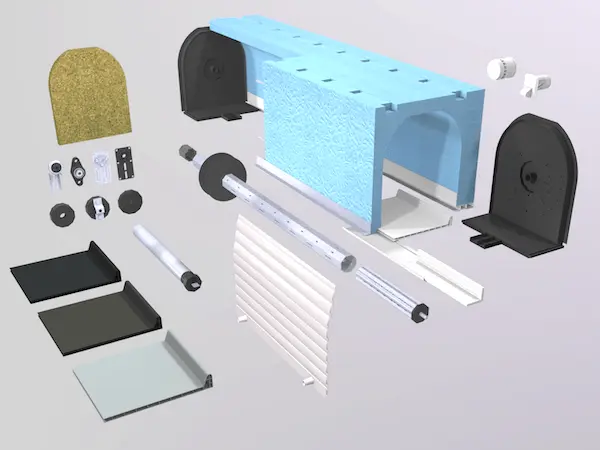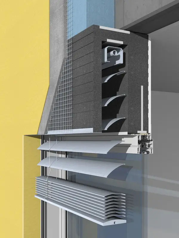 Cajón especializado para venecianas exteriores con un alto nivel de aislamiento térmico que cumple con los estándares Passivhaus. Ideal para construcciones sostenibles y envolventes arquitectónicas eficientes.