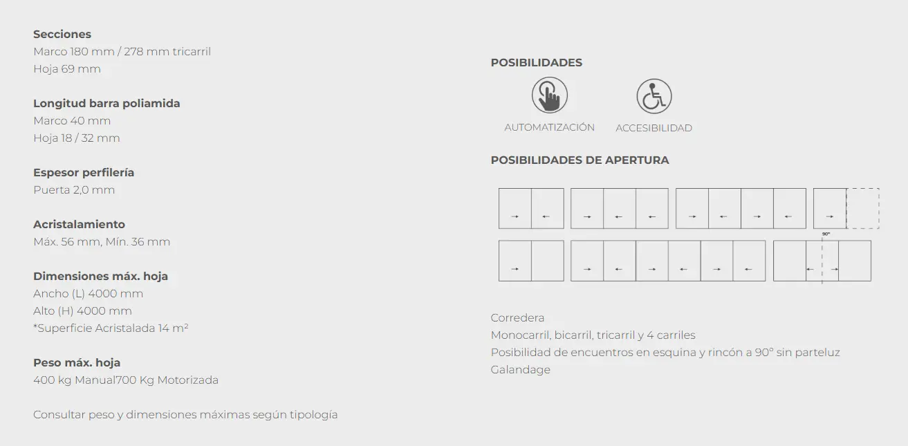La grandeza del minimalismo se refleja en esta corredera de grandes dimensiones con hojas de hasta 4 metros, nudo central de tan solo 25 mm y marcos embutidos perimetralmente, permitiendo una superficie acristalada de hasta el 94 %. Presenta una capacidad de acristalamiento máxima de 56 mm, ofreciendo unas excelentes prestaciones térmicas y acústicas. Disponible con sistema de apertura manual (hasta 400 kg) o motorizada (hasta 700 kg). Por su parte, la accesibilidad se ve favorecida por la posibilidad de embutir el carril e incluso integrarlo totalmente con el suelo.