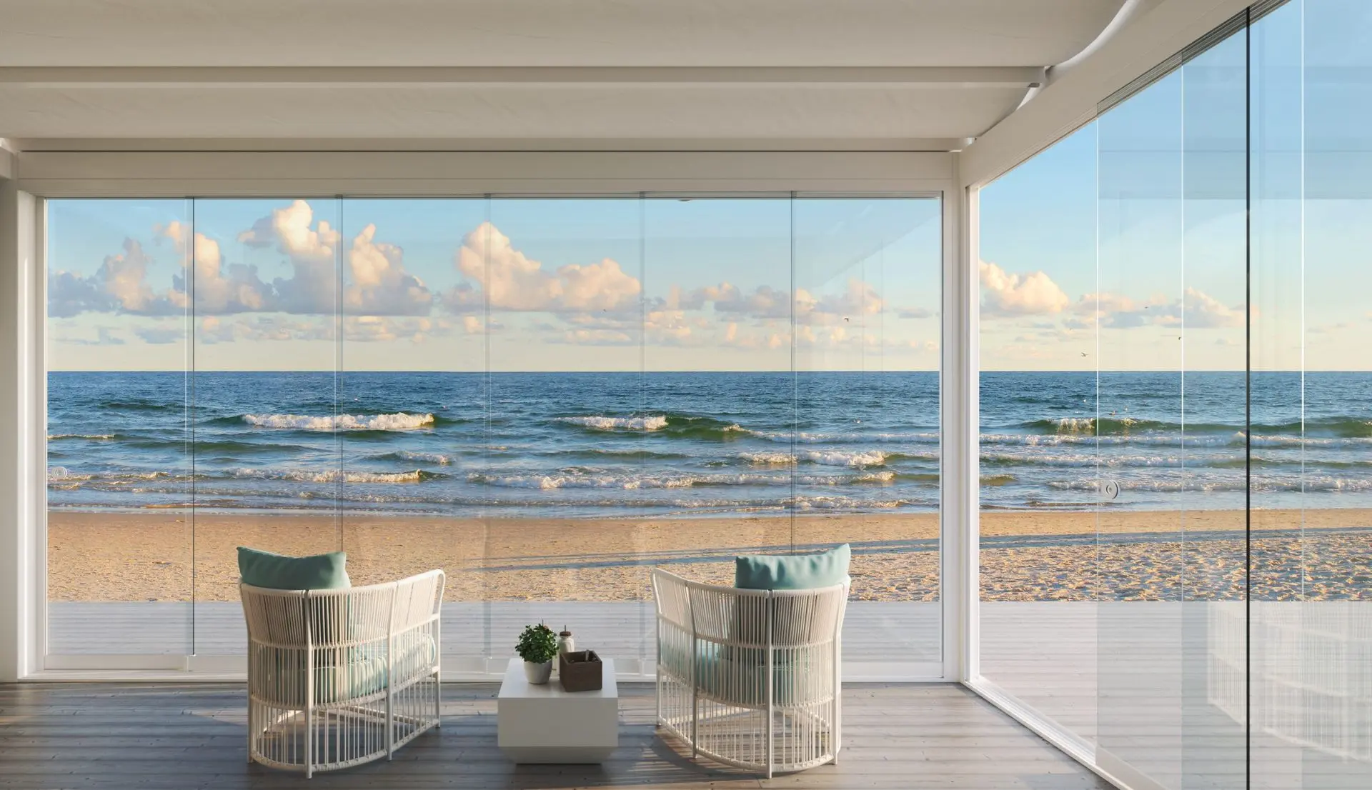 Gracias a su diseño sin marcos verticales, las cortinas de cristal DISPER permiten una vista completamente despejada del exterior. Ya estén abiertas o cerradas, crean una conexión visual continua con el entorno, aportando luminosidad, amplitud y una experiencia panorámica real. Perfectas para terrazas con vistas, jardines o áticos donde cada detalle del paisaje cuenta.