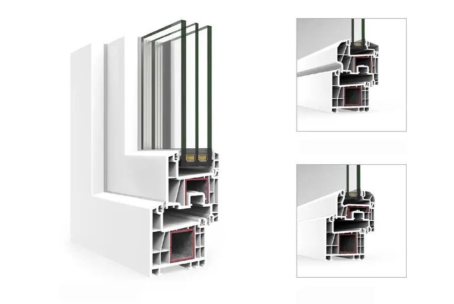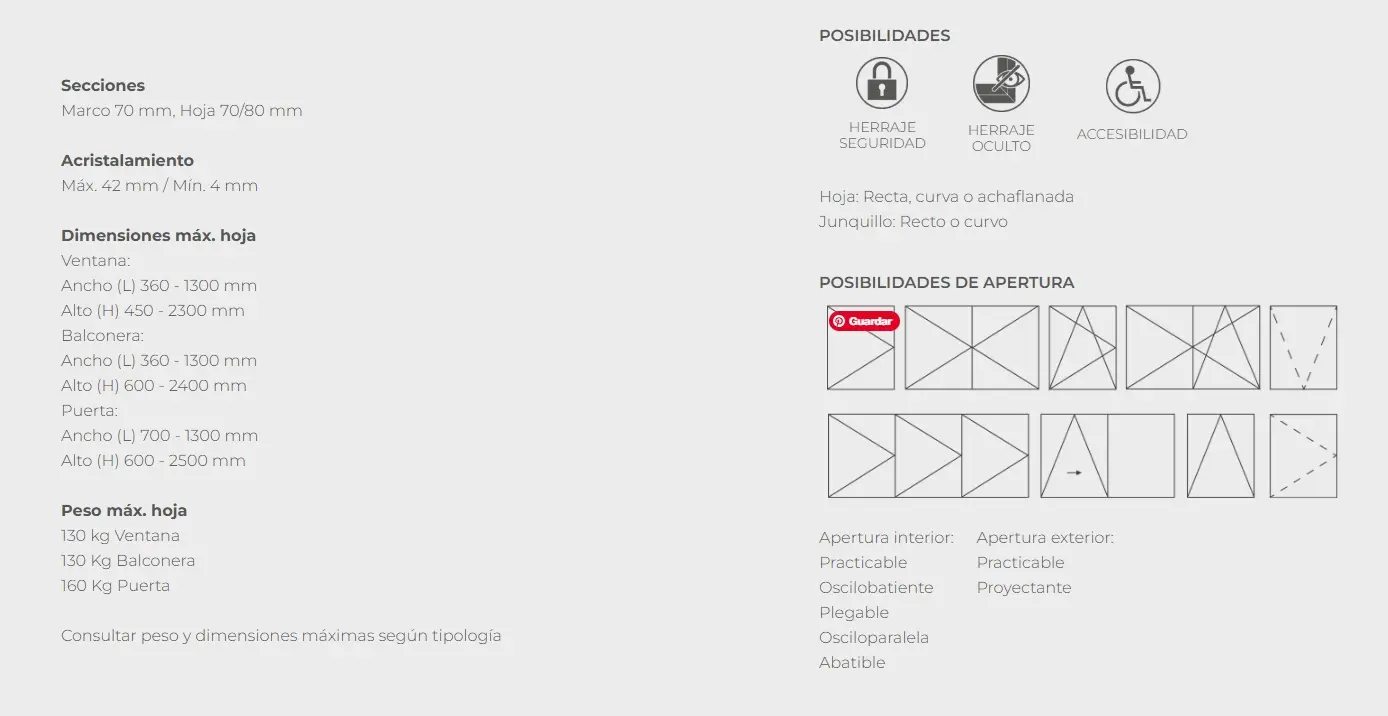Sistema abisagrado de 70 mm de profundidad de marco con una capacidad máxima de acristalamiento de 42 mm. Su perfilería de 5 cámaras interiores en marco y hoja le confiere una gran eficiencia energética con un valor de transmitancia Uw desde 0,9 W/m²K. Posibilidad de hojas con estética recta, achaflanada o curva. Posibilidad de manilla centrada.