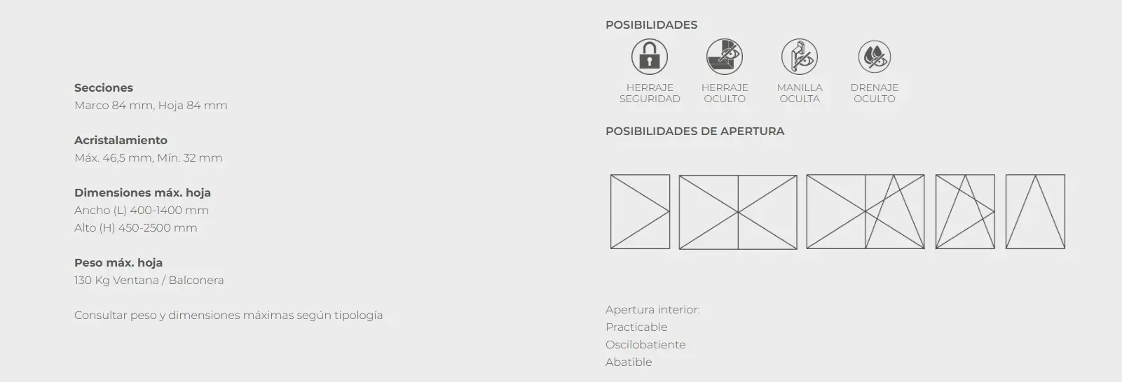 La A84 Hoja Oculta ofrece múltiples opciones de apertura, admite vidrios de gran espesor y alcanza altas clasificaciones en permeabilidad al aire, estanqueidad al agua y resistencia al viento, lo que garantiza un rendimiento técnico elevado y una excelente durabilidad del sistema.
