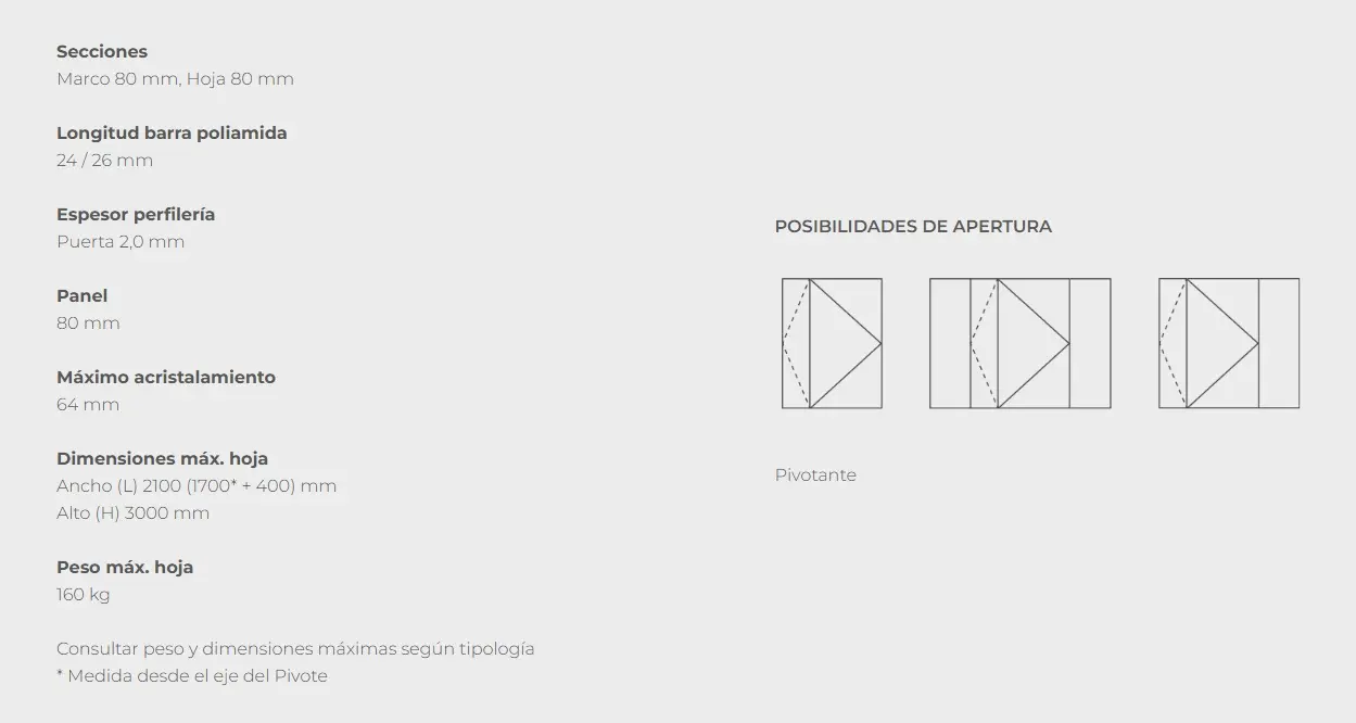 Su funcionamiento pivotante aporta una apertura amplia y espectacular difícil de conseguir con una puerta convencional. El eje de giro desplazado permite manejar hojas de gran tamaño con sorprendente suavidad, ofreciendo un movimiento estable, silencioso y muy agradable al uso. La Millennium Plus Pivot aporta ese efecto “wow” que convierte la entrada en un punto focal del proyecto, tanto en viviendas de diseño como en espacios comerciales o profesionales.