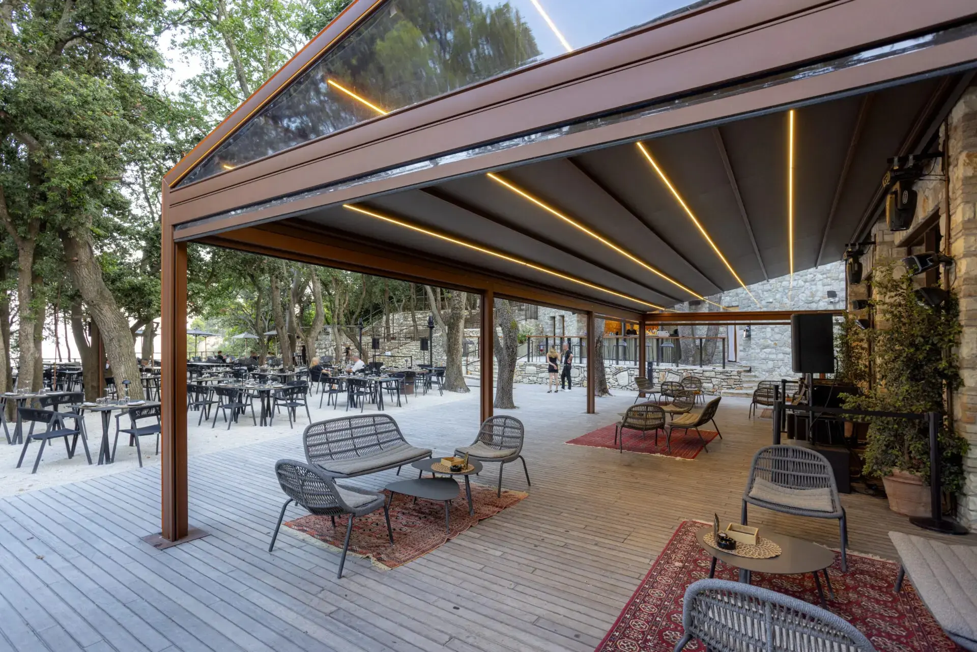 Personalízala con colores de estructura, telas técnicas, iluminación LED y sistemas laterales para crear un espacio exterior tan versátil como tú. Apuesta por la excelencia. Apuesta por A100.