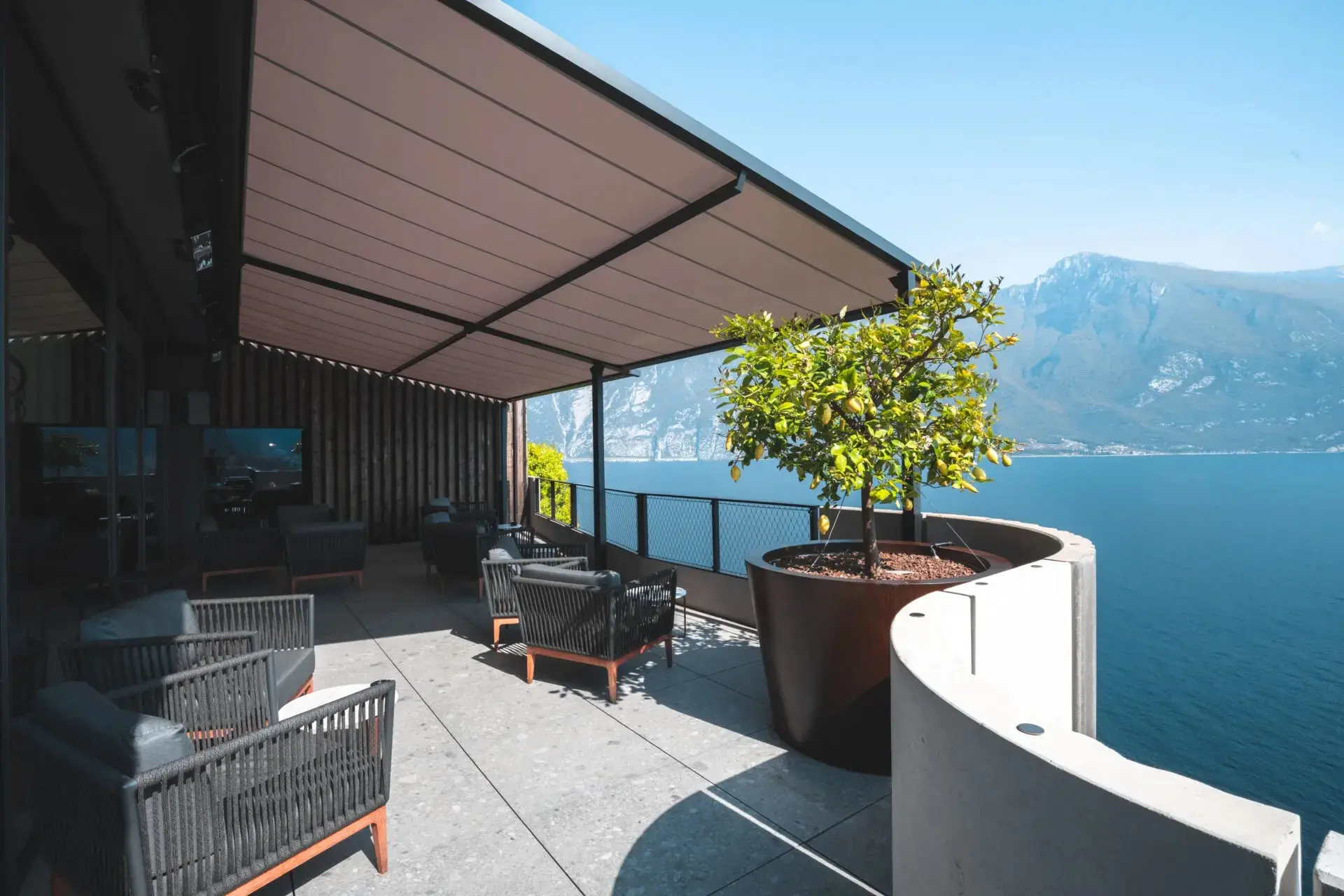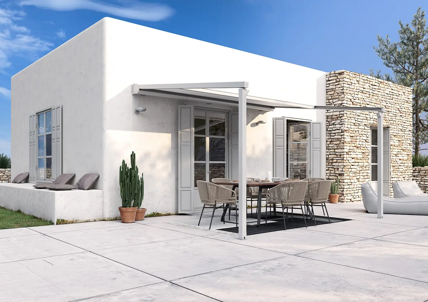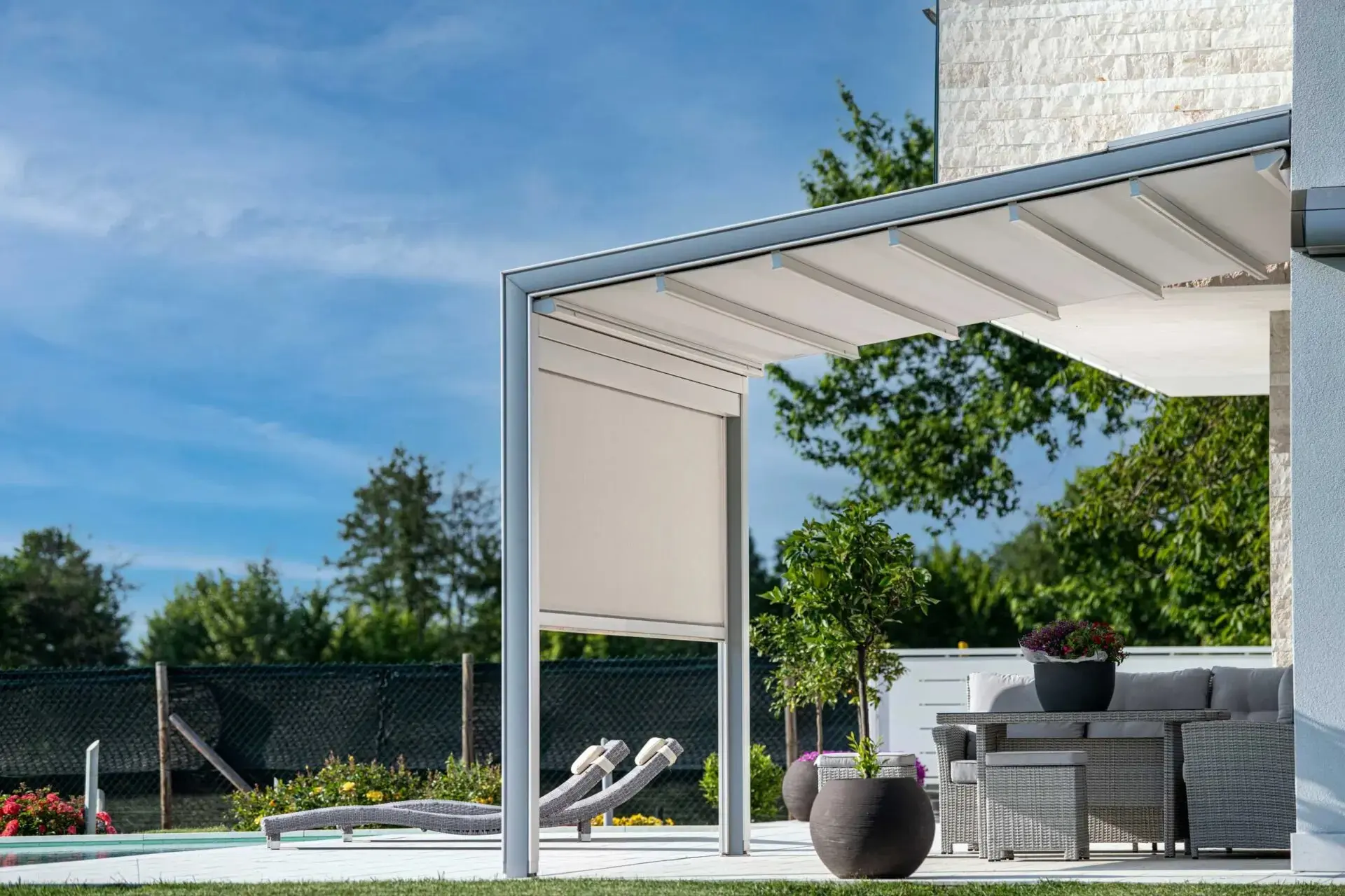 Su diseño limpio, sin guías visibles ni estructuras voluminosas, ofrece una estética “todo cielo” cuando se recoge el toldo, y una sombra elegante cuando se despliega. Además, permiten añadir iluminación LED, cierres perimetrales o automatización total.