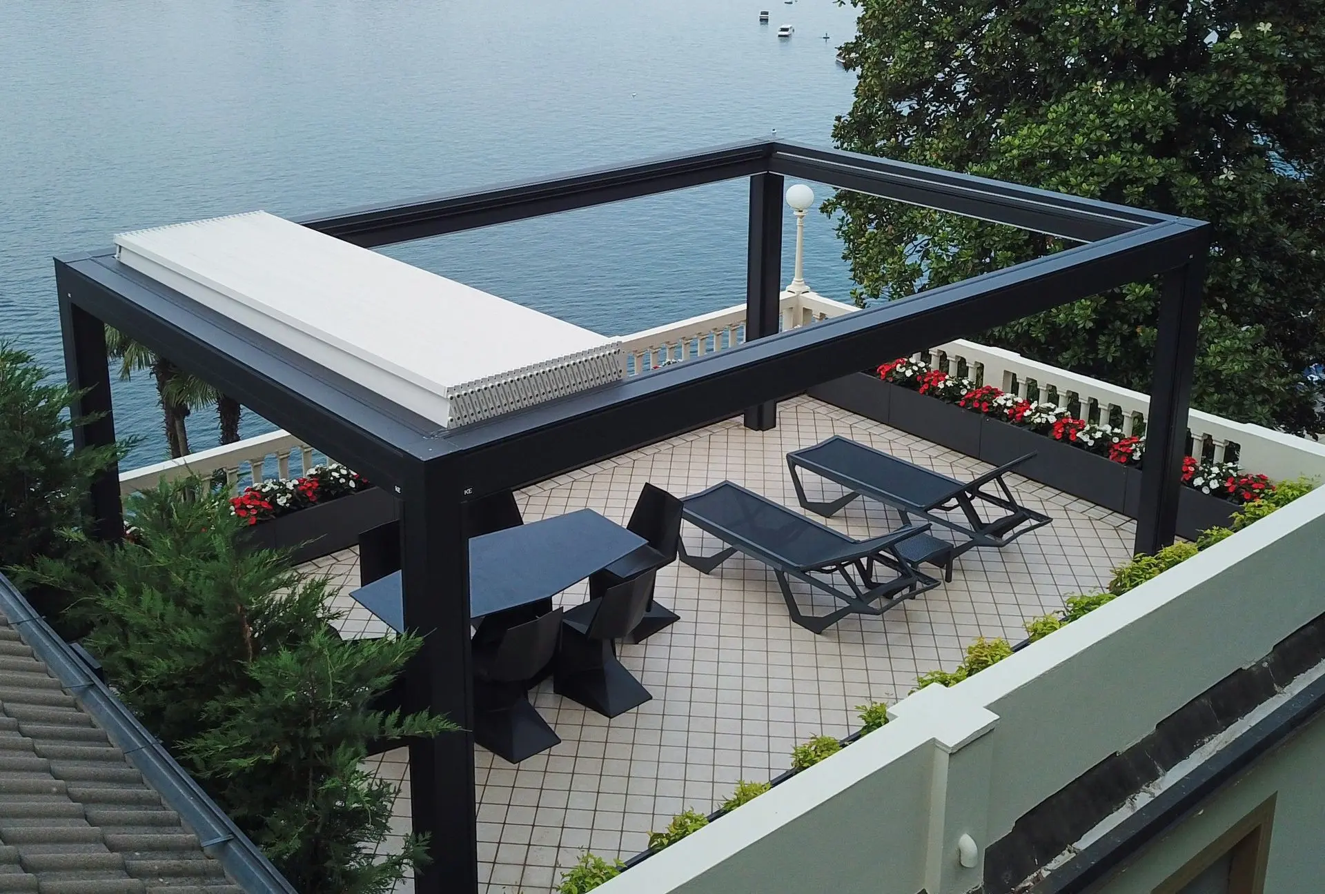 Con la máxima elegancia puede alcanzar hasta 13 mts de ancho uniendo módulos, con una proyección máxima de 5 mts, lo que convierte a esta pérgola en una solución ideal para cubrir grandes espacios exteriores de forma continua, sin interrupciones visuales ni postes intermedios.