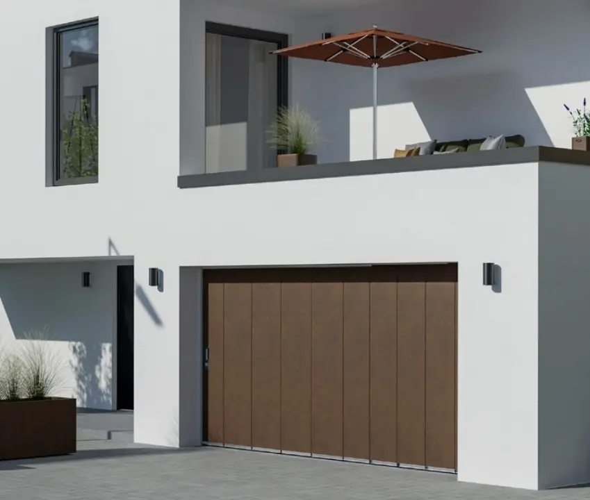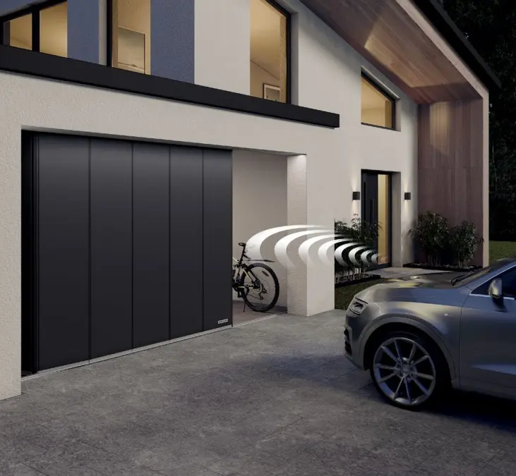 Su sistema de apertura lateral no solo aporta un valor estético singular, sino que también ofrece una funcionalidad diaria extraordinaria. La puerta puede abrirse parcialmente para permitir un paso peatonal rápido, sin necesidad de accionar toda la hoja. Esto es especialmente útil cuando se accede al garaje a pie, con bicicleta o simplemente para guardar herramientas, sin abrir completamente el sistema.