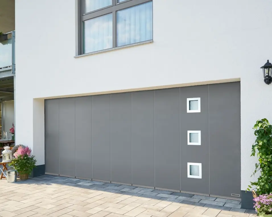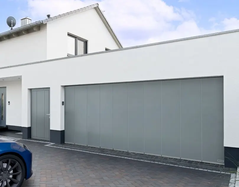 La puerta seccional lateral Hörmann combina una apertura poco convencional con una ingeniería precisa. Se desplaza lateralmente sobre un sistema de guías superior e inferior, lo que permite un movimiento estable, suave y sin vibraciones. Este sistema es especialmente útil en garajes con techos inclinados, vigas visibles o limitaciones estructurales que impiden una instalación convencional.