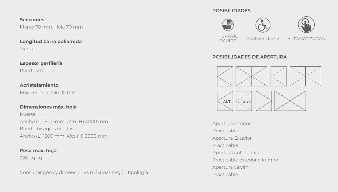 Sistema de puerta peatonal coplanaria de 70 mm de profundidad que garantiza un elevado aislamiento térmico y acústico.
