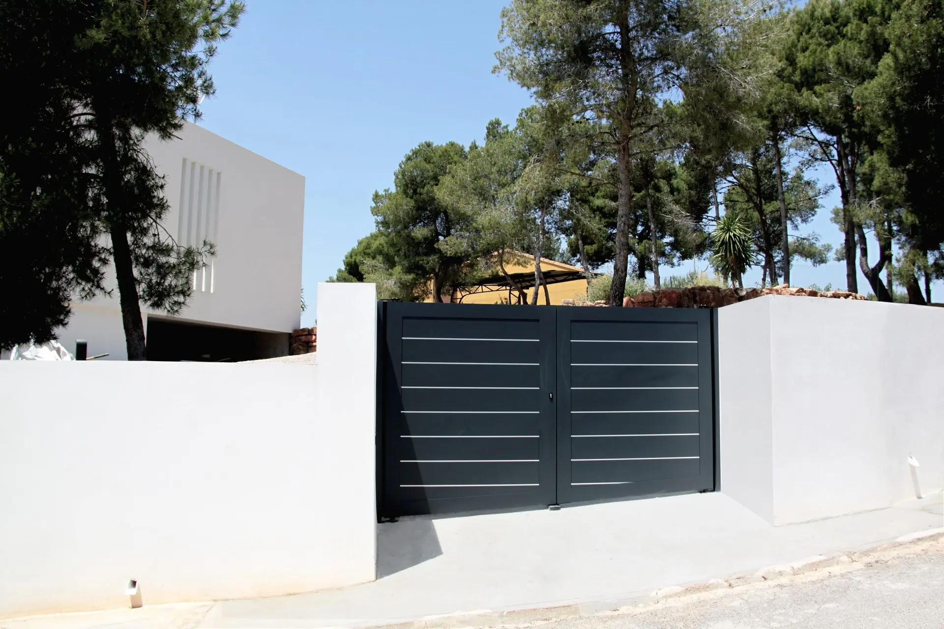 Fabricadas en aluminio extrusionado, estas puertas garantizan resistencia estructural, durabilidad ante la intemperie y un bajo mantenimiento, lo que las hace ideales para zonas exteriores expuestas. A nivel estético, ofrecen una enorme libertad creativa: paneles ciegos, lamas horizontales u opciones acristaladas pueden combinarse con una amplia gama de acabados RAL, anodizados o imitación madera, asegurando una integración perfecta con cualquier diseño de fachada.