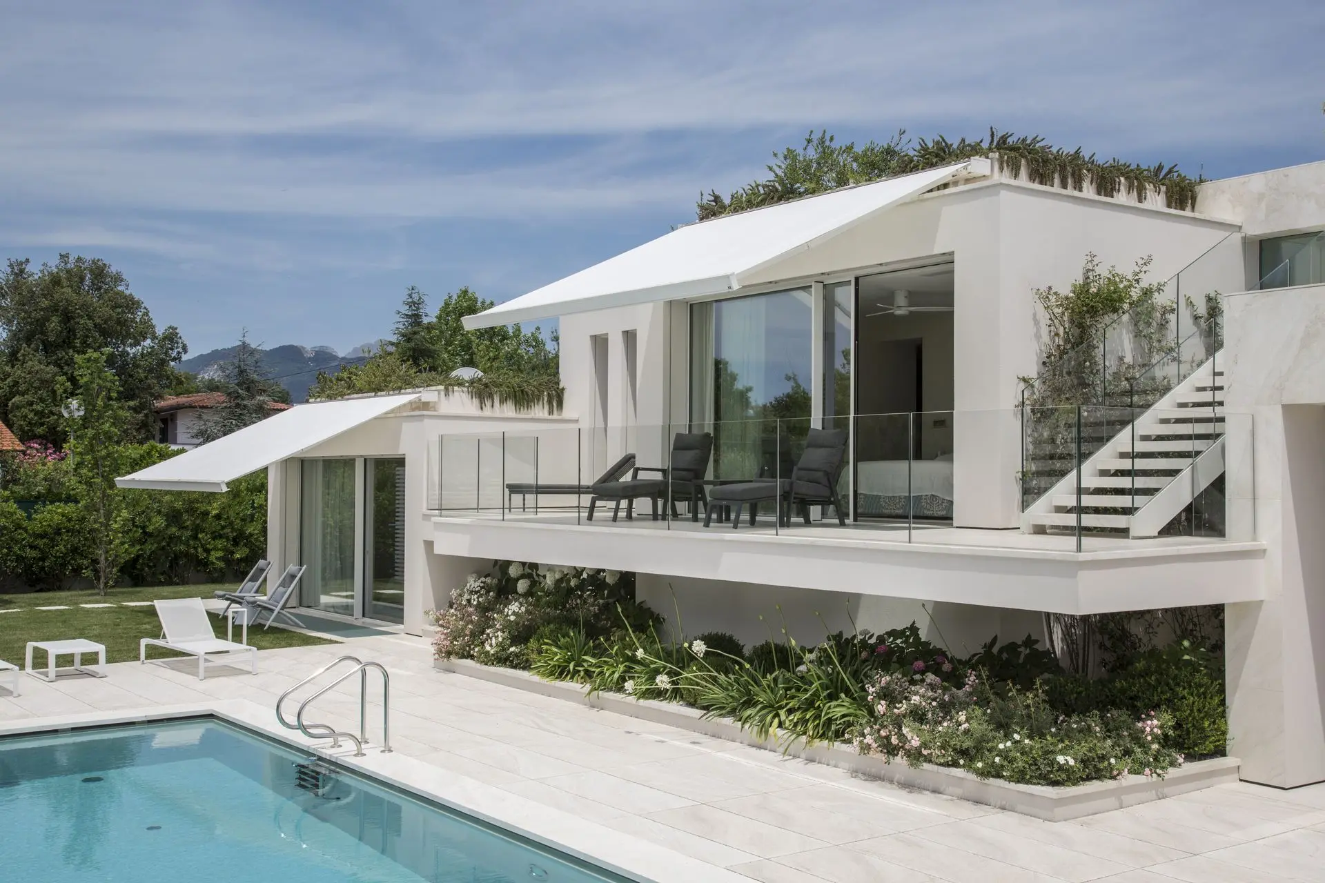 Colores, acabados bicolor, combinación de cofre y brazos, opción de tira LED… QUBICA FLAT se adapta al gusto del cliente para formar parte del diseño exterior, no solo como toldo, sino como pieza de exterior.