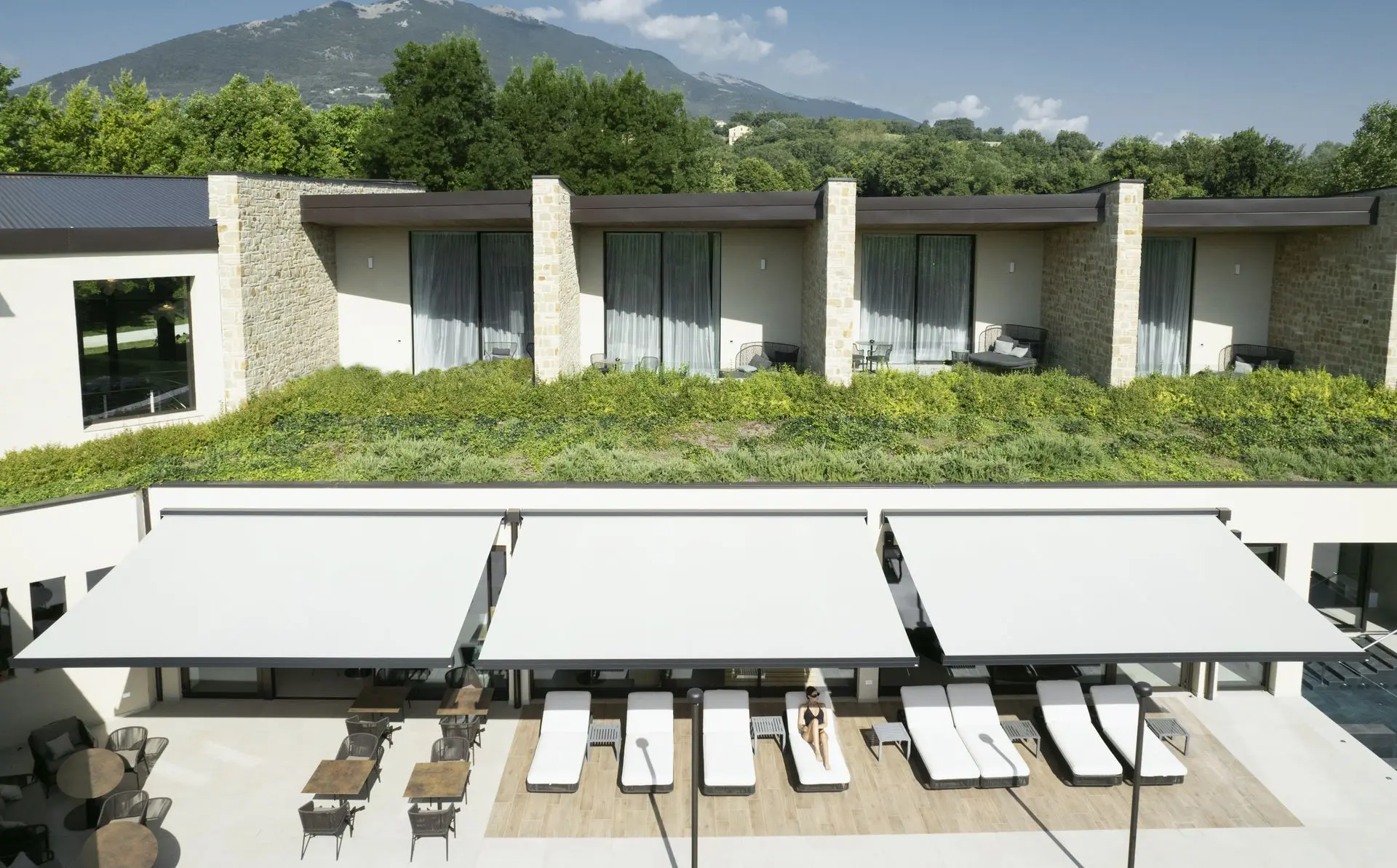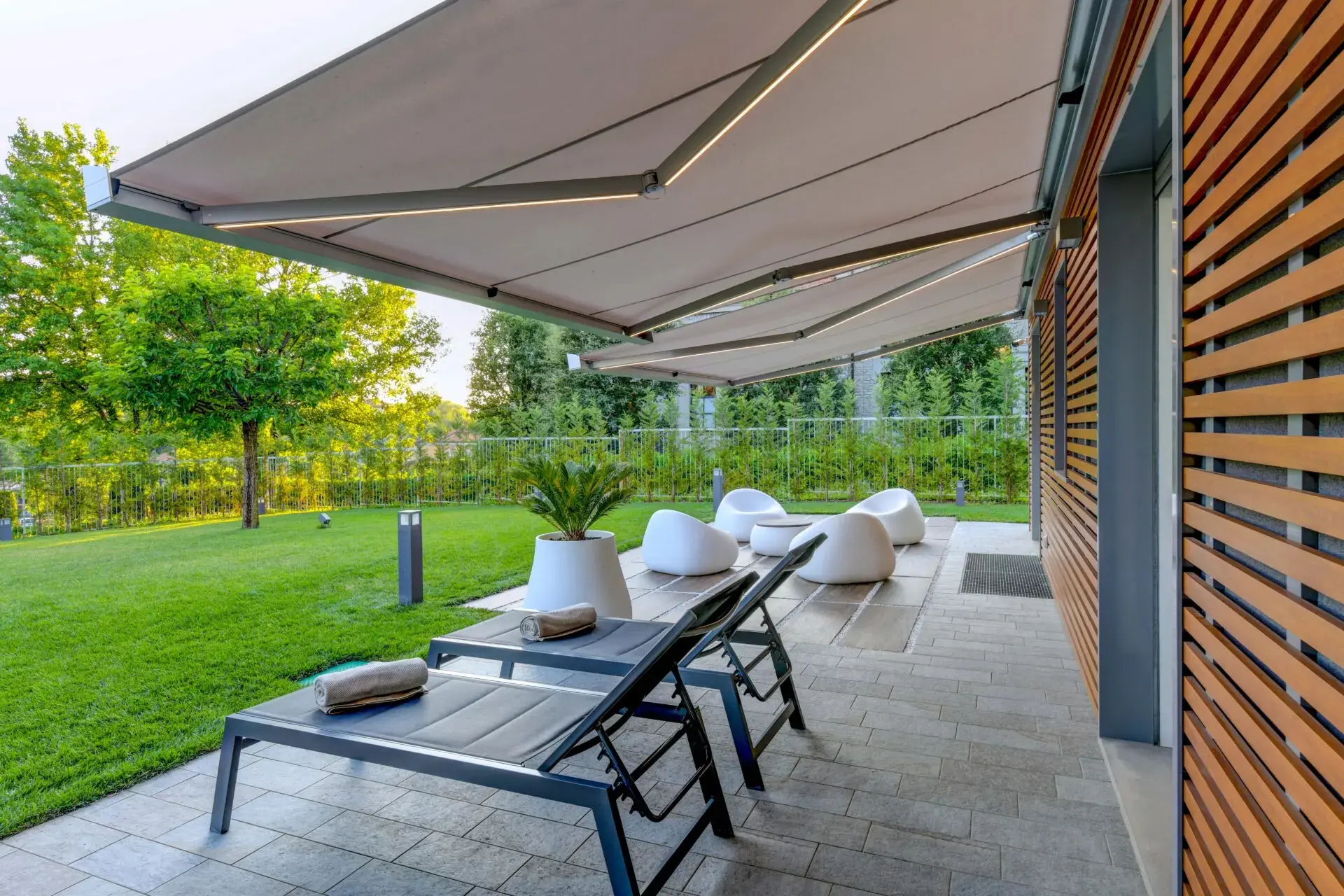 Modelo PLUMP - Con su cofre totalmente hermético y mecanismo motorizado, PLUMP ofrece una apertura fluida y un acabado perfecto que transforma cualquier terraza